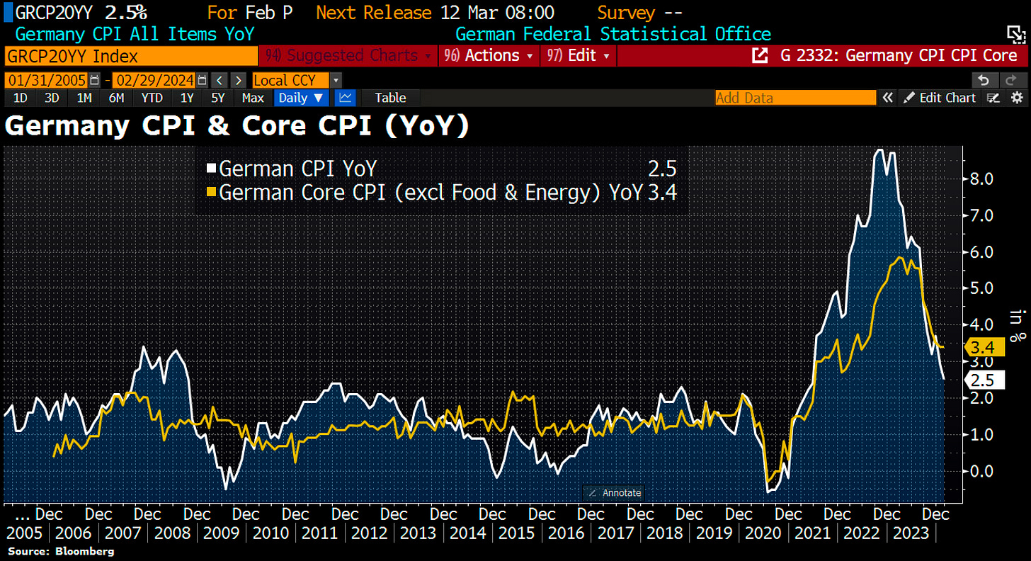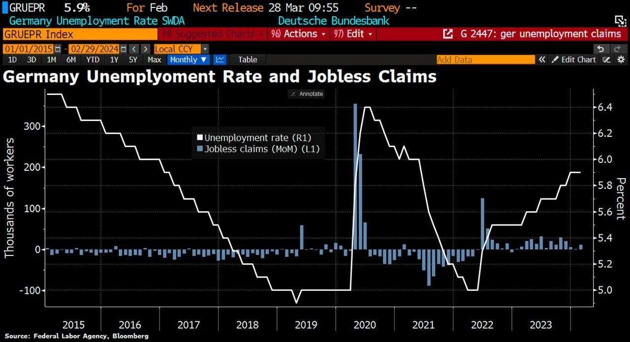 2- Las solicitudes de desempleo alemanas aumentaron en 11.000 en febrero, más del doble de las 5.000 previstas por los analistas. La tasa de desempleo ajustada estacionalmente se mantuvo en 5,9%, su nivel más alto en >2 años. La resiliencia del mercado laboral ha sido una de las pocas ventajas para la economía alemana, al menos hasta ahora, a pesar de la caída del PIB. (vía BBG)