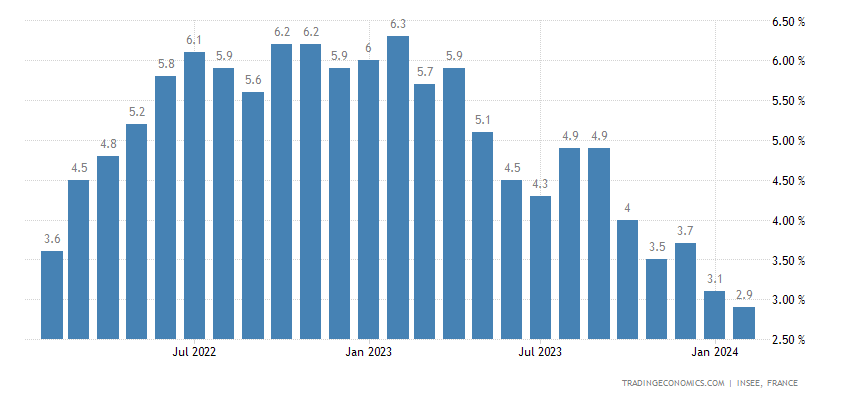 La tasa de inflación anual en Francia se ralentizó hasta el 2,9% en febrero de 2024, la más baja desde enero de 2022, desde el 3,1% de enero, pero los mercados esperaban que se suavizara más hasta el 2,7%, según las estimaciones preliminares.