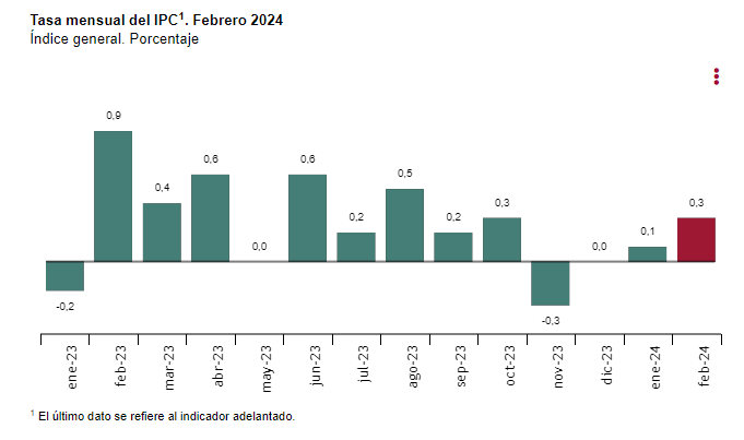 La inflación anual estimada del IPC en febrero de 2024 es del 2,8%, de acuerdo con el indicador adelantado elaborado por el INE.