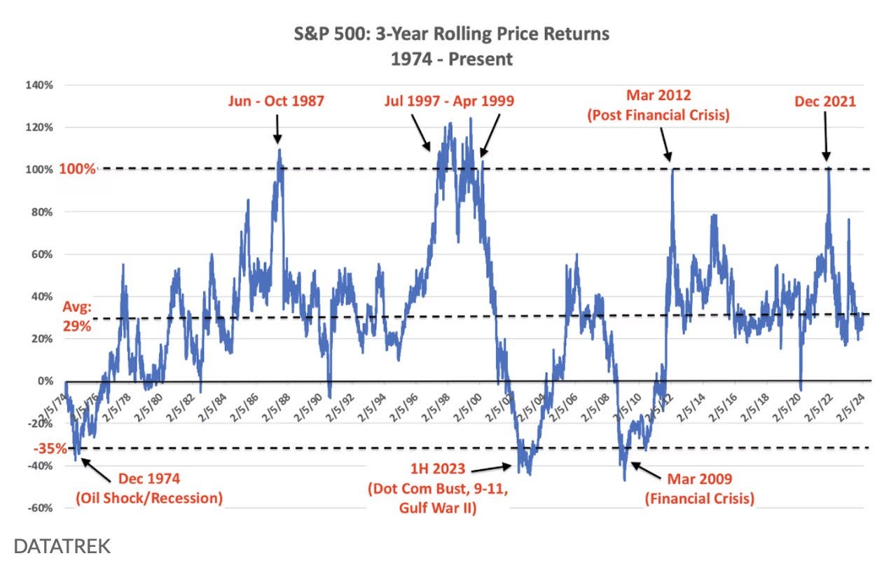 6- Desde 1974, el S&P 500 generó rendimientos de al menos el 100% durante los 3 años anteriores a cada pico de burbuja. En los últimos 3 años, el SPX sólo ha subido un 31%, lo que equivale básicamente a la rentabilidad media móvil de 3 años. En otras palabras, los datos muestran que probablemente no se trate de una burbuja. - DataTrek