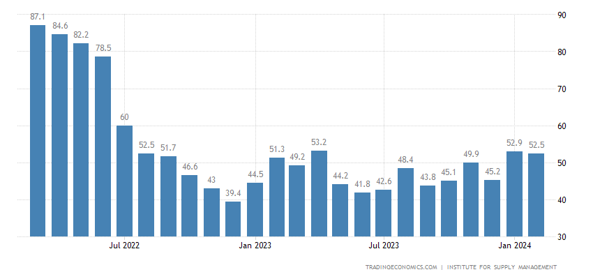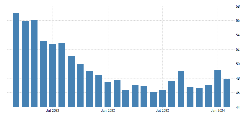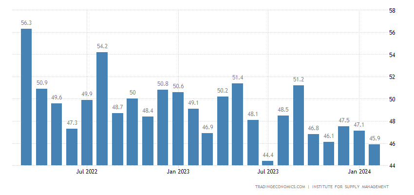 El PMI manufacturero ISM de Estados Unidos cayó a 47,8 en febrero de 2024 desde los 49,1 del mes anterior, muy por debajo de las expectativas del mercado de 49,5, para señalar el decimosexto periodo consecutivo de descensos en la actividad manufacturera, borrando las esperanzas previas de una nueva tracción en el sector.