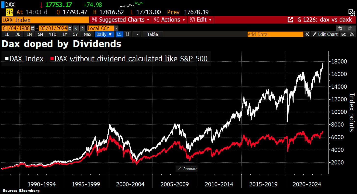 2- Para poner las cosas en perspectiva: Esta semana, el Dax realmente alcanzó un ATH. El conocido Dax se calcula como un índice de rendimiento y está dopado con dividendos, pero ahora el desconocido índice de precios del Dax sin dividendos también ha batido un récord. -Holger Zschaepitz