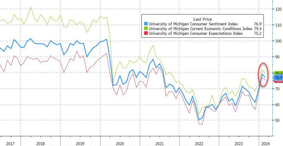 El índice de sentimiento cayó a 76,9 desde 79 en enero (más bajo que todas las estimaciones). El indicador de las condiciones actuales cayó el mes pasado a 79,4 y la medida de las expectativas cayó a 75,2 desde enero.