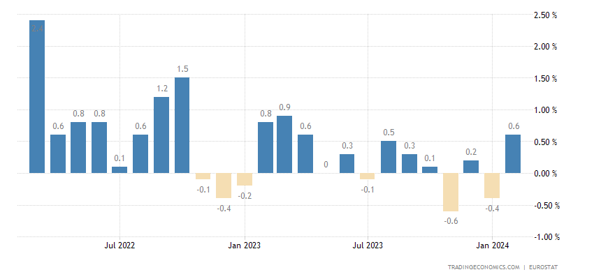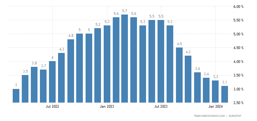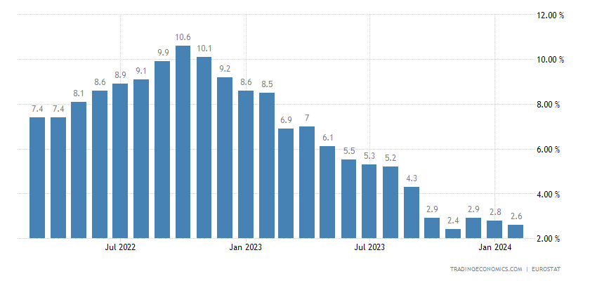 La tasa de inflación de precios al consumidor en la Zona Euro disminuyó al 2.6% interanual en febrero de 2024, frente al 2.8% del mes anterior, pero permaneció ligeramente por encima de las expectativas del mercado del 2.5%, según una estimación preliminar.