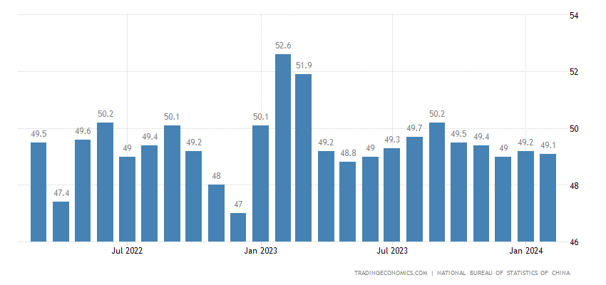 El Índice de Gerentes de Compras (PMI) Manufacturero oficial del NBS en China descendió ligeramente a 49.1 en febrero de 2024 desde 49.2 el mes anterior, en línea con las previsiones del mercado.