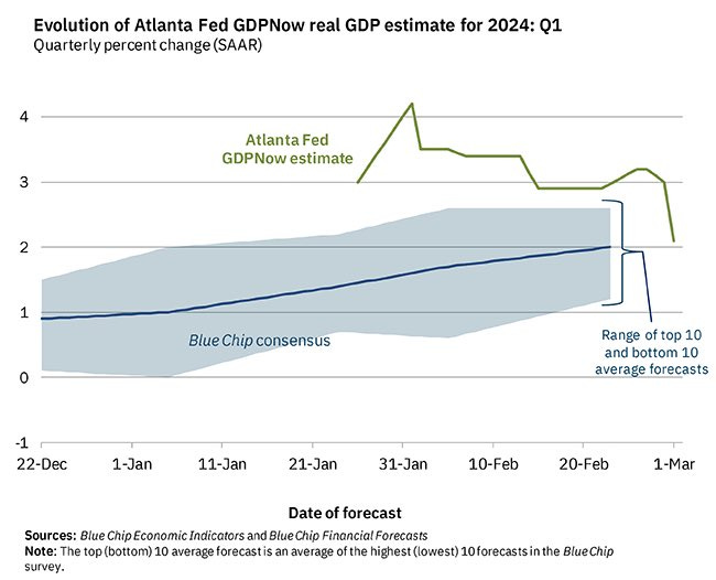 Ese dato tan tan débil fue una sorpresa y provocó que el índice adelantado de PIB de Atlanta para el 1T (ya saben que es extremadamente volatil), cayera al 2,1% desde el desde más del 3%. Se redujeron las contribuciones del gasto de los consumidores y de la inversión residencial: