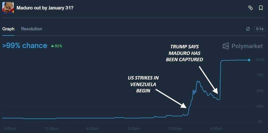 Hace unas 16 horas, había solo un 7% de posibilidades de que el presidente Maduro dejara el poder el 31 de enero, según Polymarket.