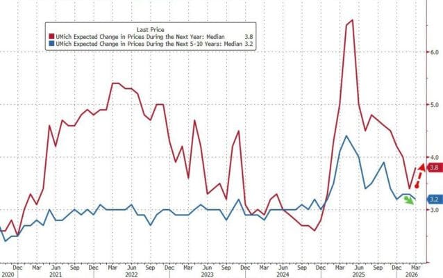 Las expectativas de inflación a un año subieron al 3,8%, el mayor incremento mensual desde abril de 2025, mientras que las expectativas a largo plazo descendieron ligeramente hasta el 3,2%.