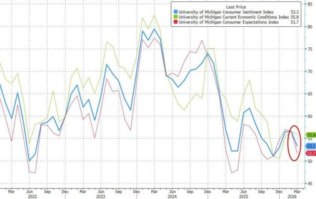 El índice de confianza del consumidor de la Universidad de Michigan cayó con fuerza hasta 53,3 en marzo de 2026, desde la estimación preliminar de 55,5 y por debajo del 56,6 de febrero. Esto sitúa la confianza cerca de los mínimos registrados a finales de 2025, con descensos en todos los grupos de edad y afiliaciones políticas.