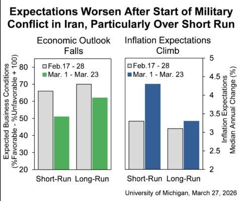 Los hogares con ingresos medios y altos, así como aquellos con exposición a bolsa, experimentaron las mayores caídas en la confianza. El deterioro refleja el impacto del aumento de los precios de la gasolina y la volatilidad de los mercados financieros, ambos agravados por el conflicto con Irán.