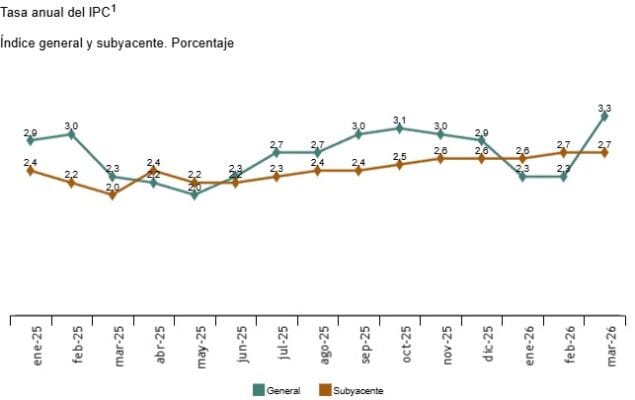 La inflación anual estimada del IPC en marzo de 2026 es del 3,3%. Este indicador proporciona un avance del IPC que, en caso de confirmarse, supondría que la tasa anual aumenta un punto, ya que en el mes de febrero esta variación fue del 2,3%.