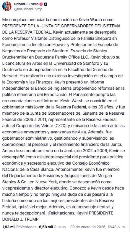 Y así fue: A primera hora de la tarde (mañana en EEUU), Trump dijo que nominará a Kevin Warsh como presidente de la Reserva Federal.