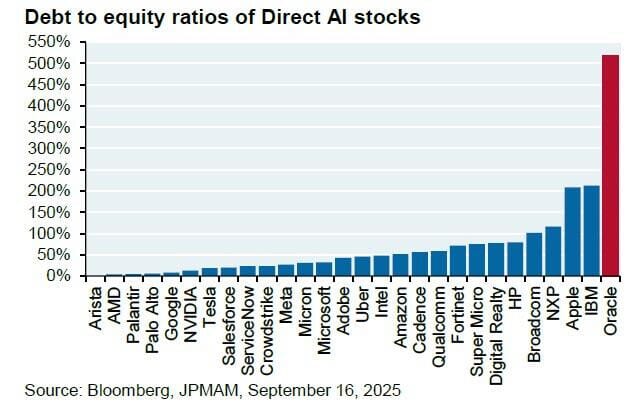 Pero lo realmente llamativo es que Oracle está utilizando a JPMorgan para vender esta gigantesca deuda, el mismo JPMorgan cuyo estratega jefe de mercado, Michael Cembalest, publicó el mes pasado en su nota Eye on the Market lo siguiente: