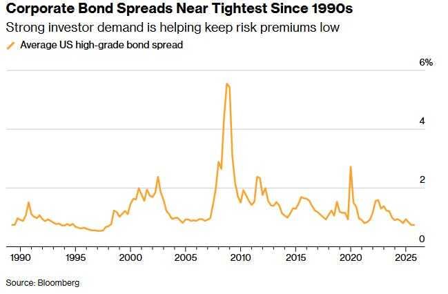 Los diferenciales de los bonos corporativos están cerca de su nivel más bajo desde la década de 1990, reflejo de la fuerte demanda.