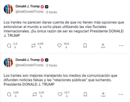 El presidente de EE. UU., Donald Trump, publicó: “Hay informes de que Irán está cobrando tasas a los petroleros que atraviesan el Estrecho de Ormuz — ¡Más les vale no estar haciéndolo y, si lo están, más les vale parar ya!”