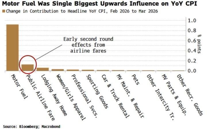 Como nota al margen, y como señal de los primeros efectos de la segunda ronda, el segundo cambio más rápido en la contribución al IPC general (y subyacente) anual, después del combustible para motores, provino de los billetes de avión, que ahora por sí solos contribuyen con un 0,15% a la cifra interanual...