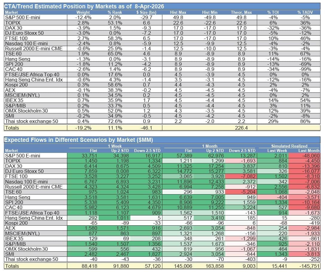 Tras el movimiento al alza de ayer, los tres umbrales de momentum de CTAs están en territorio positivo: corto plazo (>6713), medio plazo (>6734) y largo plazo (>6400).