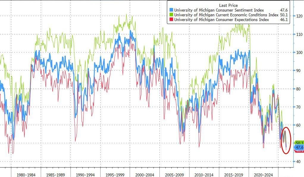 El índice de confianza del consumidor de la Universidad de Michigan se desplomó un 11% hasta un mínimo histórico de 47,6 a principios de abril de 2026, muy por debajo tanto de las expectativas del mercado (52) como del nivel del año pasado, con una caída del 9%.