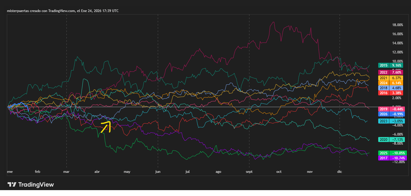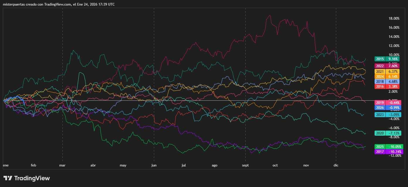 Durante el segundo semestre de 2025, tuvo sus más y sus menos, pero cotizó en rango lateral… Curiosamente 2025 y 2017 (primeros años de mandato de Trump), tuvieron un rendimiento muy similar, ambos con una caída del 10%: