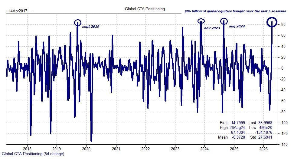 Y dado que los CTA ahora tienen posiciones extremadamente cortas, ya no eran bajistas marginales, tenían grandes desequilibrios compradores (142.000 millones de dólares a nivel mundial, 61.000 millones de dólares en EE. UU.) en caso de entrar en un mercado alcista.