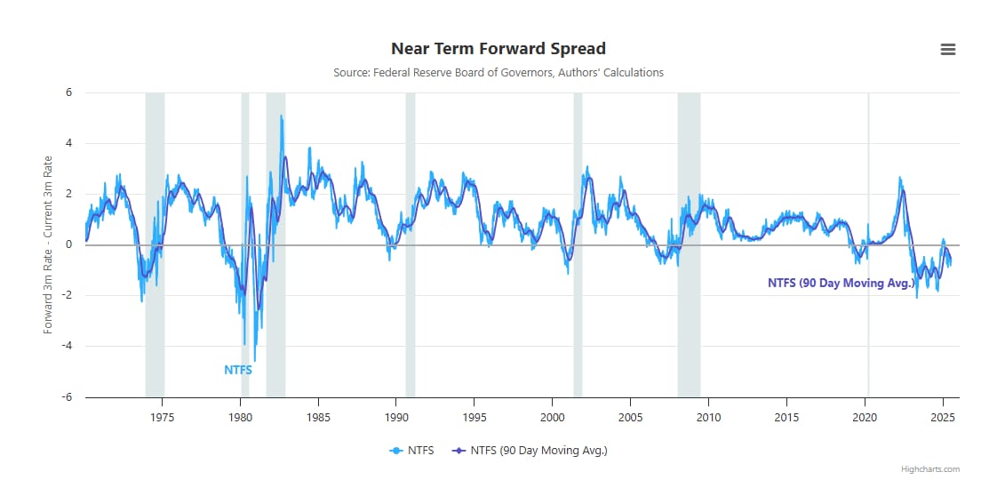 Sin embargo… Estos tramos no son los mejores indicadores… Históricamente el tramo 10y–3m y el NTFS (diferencia entre el tipo implícito a 3 meses dentro de ~18 meses y el 3 meses actual) anticipa recesión con bastante mayor fiabilidad: