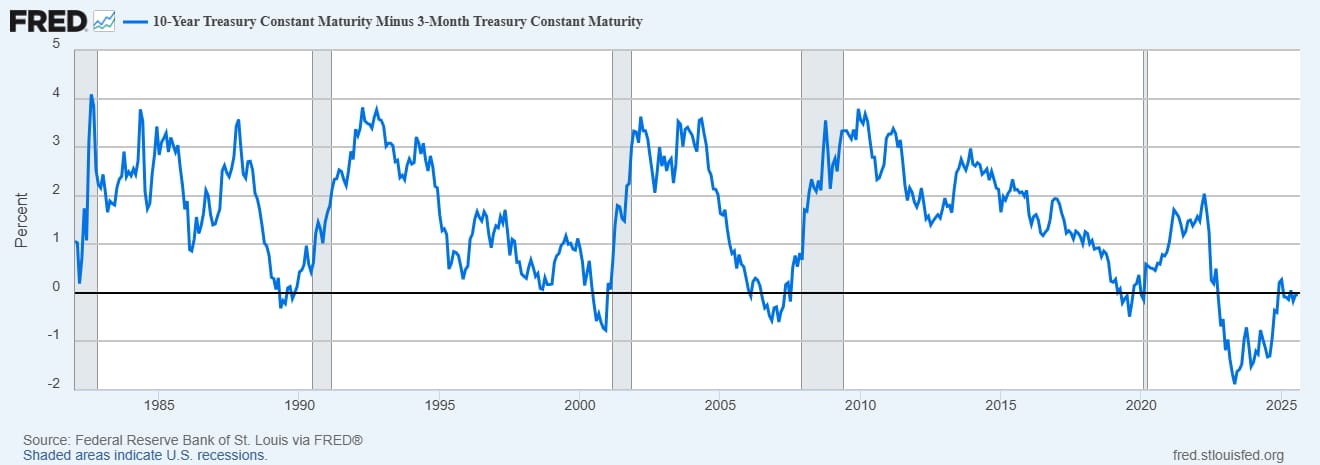 10y–3m (T10Y3M): sigue ligeramente negativo al 28-ago-2025 (-0,04%). El tramo con mejor récord histórico aún no confirma del todo la normalización.