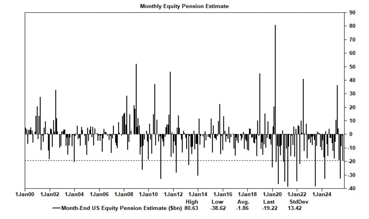 Se estima que los fondos de pensiones de EE. UU. venderán $19.000 millones en acciones estadounidenses al cierre de mes. Esta cifra de ventas se ubica en el percentil 89 entre todas las estimaciones de compras y ventas en términos absolutos de los últimos tres años, y también en el percentil 89 desde enero del 2000.