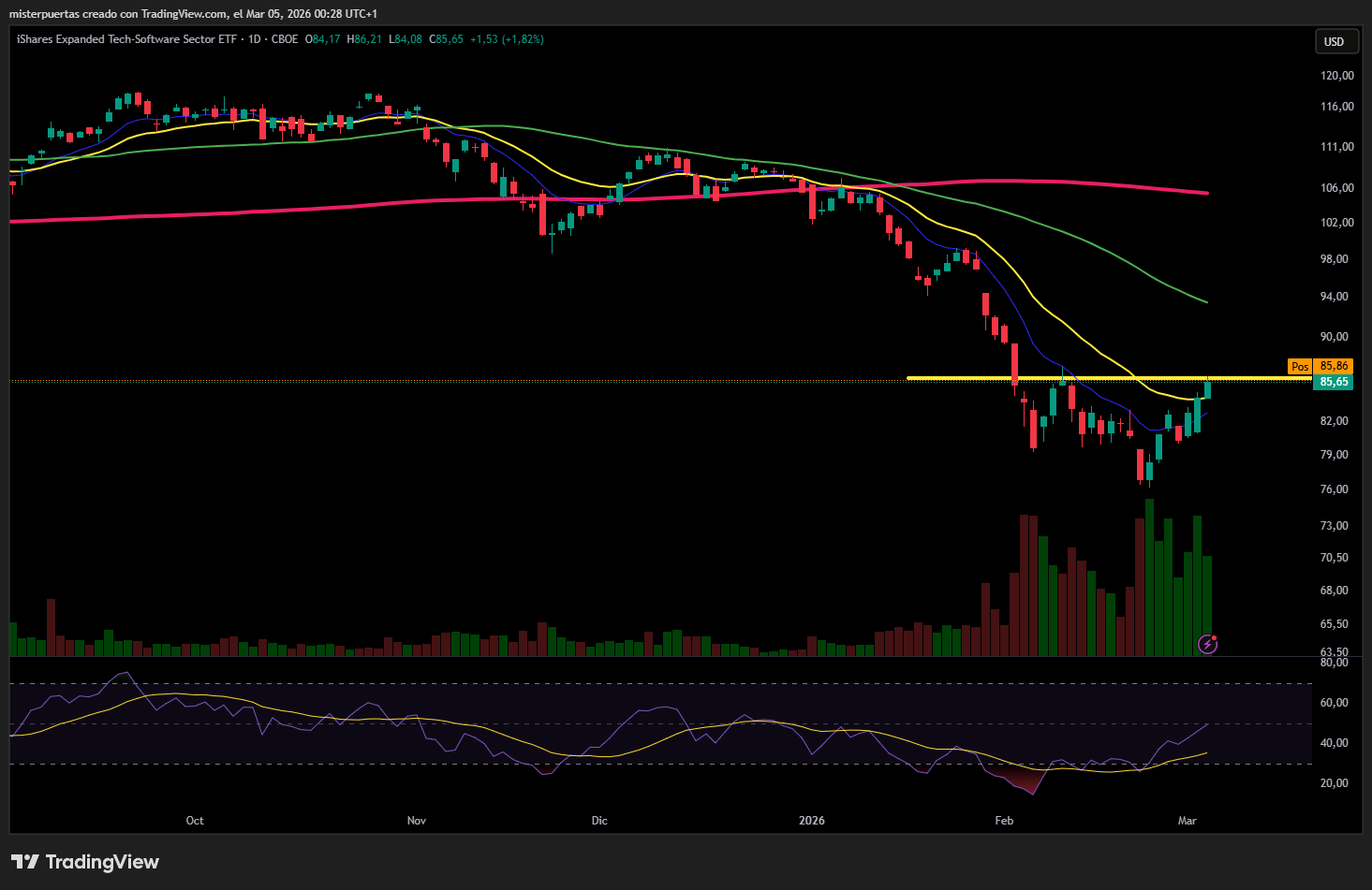 Software rebotó otro día más y se aproxima a los primeros niveles de resistencia importantes. Goldman Sachs sigue mencionando ese posicionamiento extremadamente corto que puede impulsar al sector: