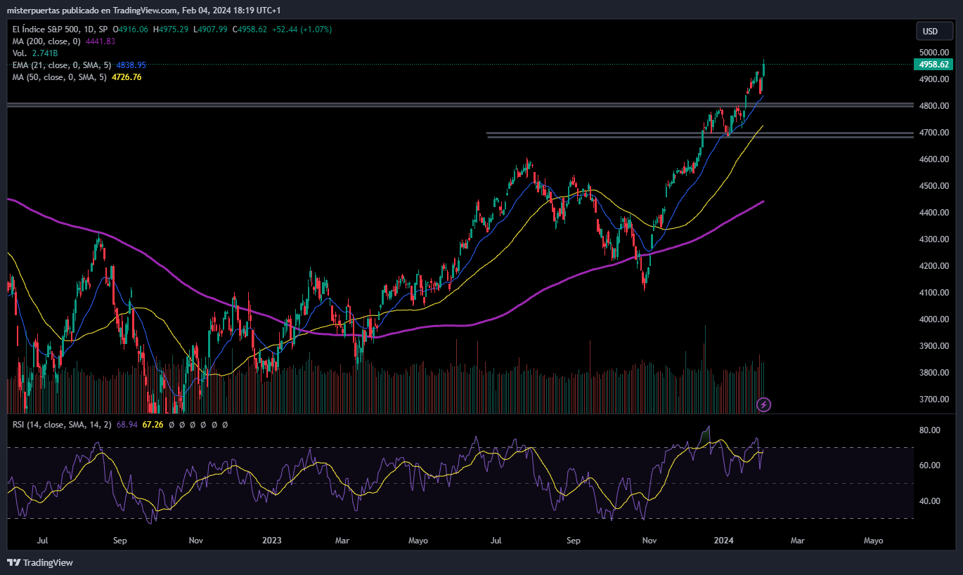 El SPX ha tenido desde noviembre uno de los mayores repuntes que se recuerdan, el índice está ya en los 5000, al encontrarse en niveles máximos, no hay aspectos técnicos que muestren resistencias. Según los cuantitativos los 5000 es un nivel importante: