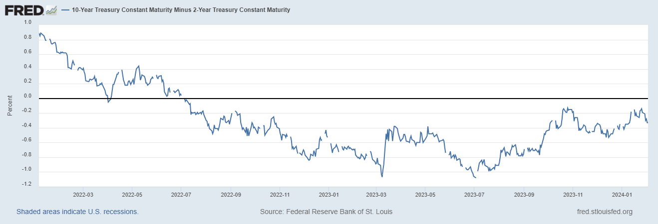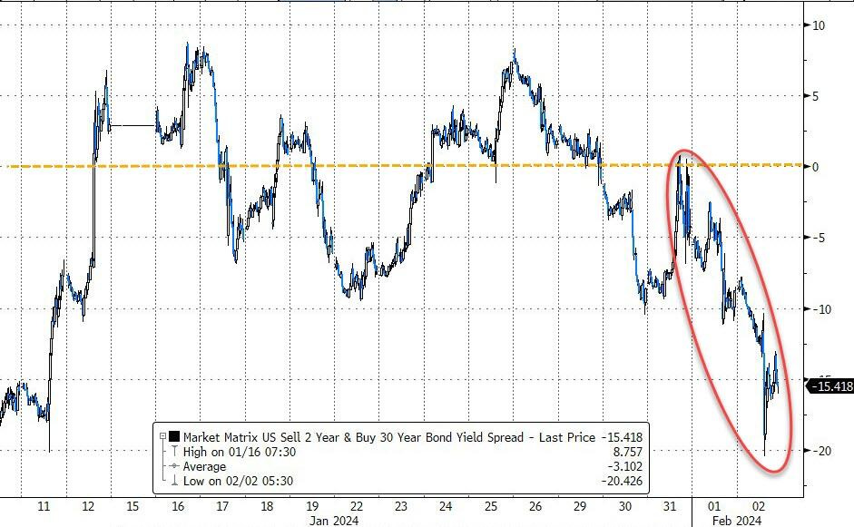 Tipos altos por más tiempo es igual a inversión de curva de tipos. 2-30 años anulando casi todo el movimiento de enero: