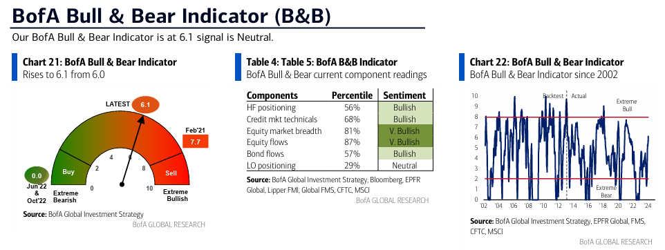 Se espera que el indicador alcance una señal de venta contraria si alcanza un valor por encima de 8.0. Para que esto ocurra, se requiere una combinación de factores adicionales, como una disminución en los niveles de efectivo de BofA FMS, entradas de dinero en deuda de mercados emergentes, que los fondos de cobertura tengan posiciones largas en futuros del S&P500 y un fuerte aumento en las acciones de China y Hong Kong.