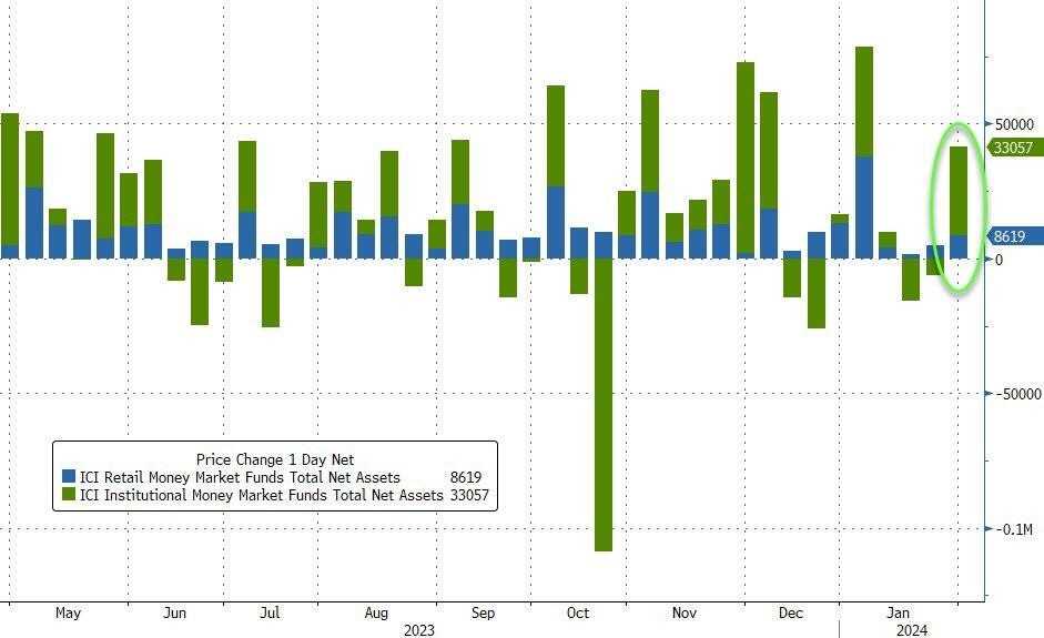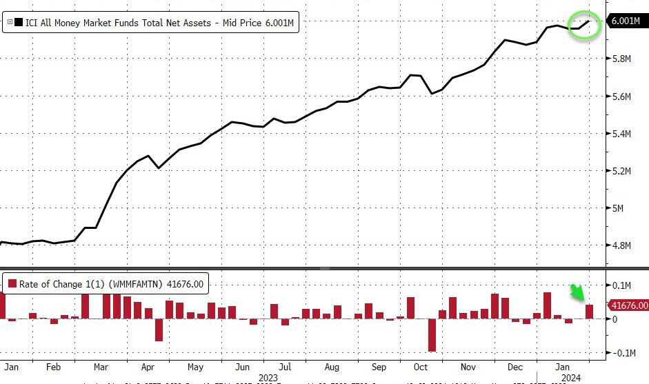 Después de dos semanas de salidas, los fondos del mercado monetario registraron entradas de 42.000 millones de dólares la semana pasada, lo que elevó los activos totales a más de 6 billones de dólares por primera vez en la historia.