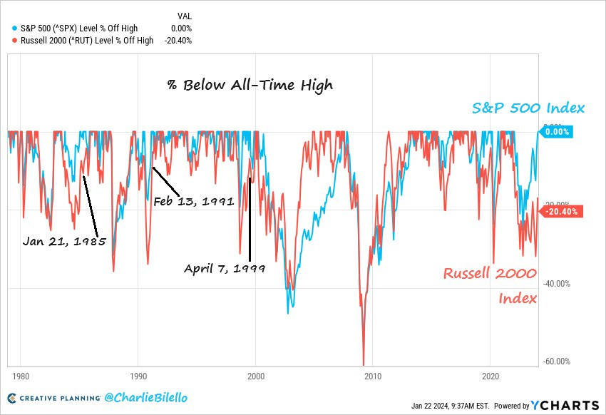 Recuerde que siempre que el SPX estaba en máximos históricos y el Russell estaba amás de un 20% de estos, finalmente ha seguido acompañando al alza. ¿Posibilidad de que las grandes consoliden y las pequeñas acompañen?