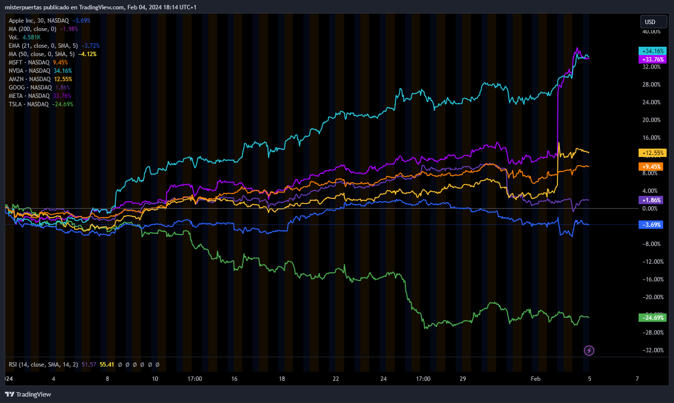 Esta semana, han presentado resultados 5 de los 7 magníficos: MSFT, GOOG, AAPL, AMZN y META. La última, el viernes sufrió el mayor aumento de market cap de la historia estadounidense;