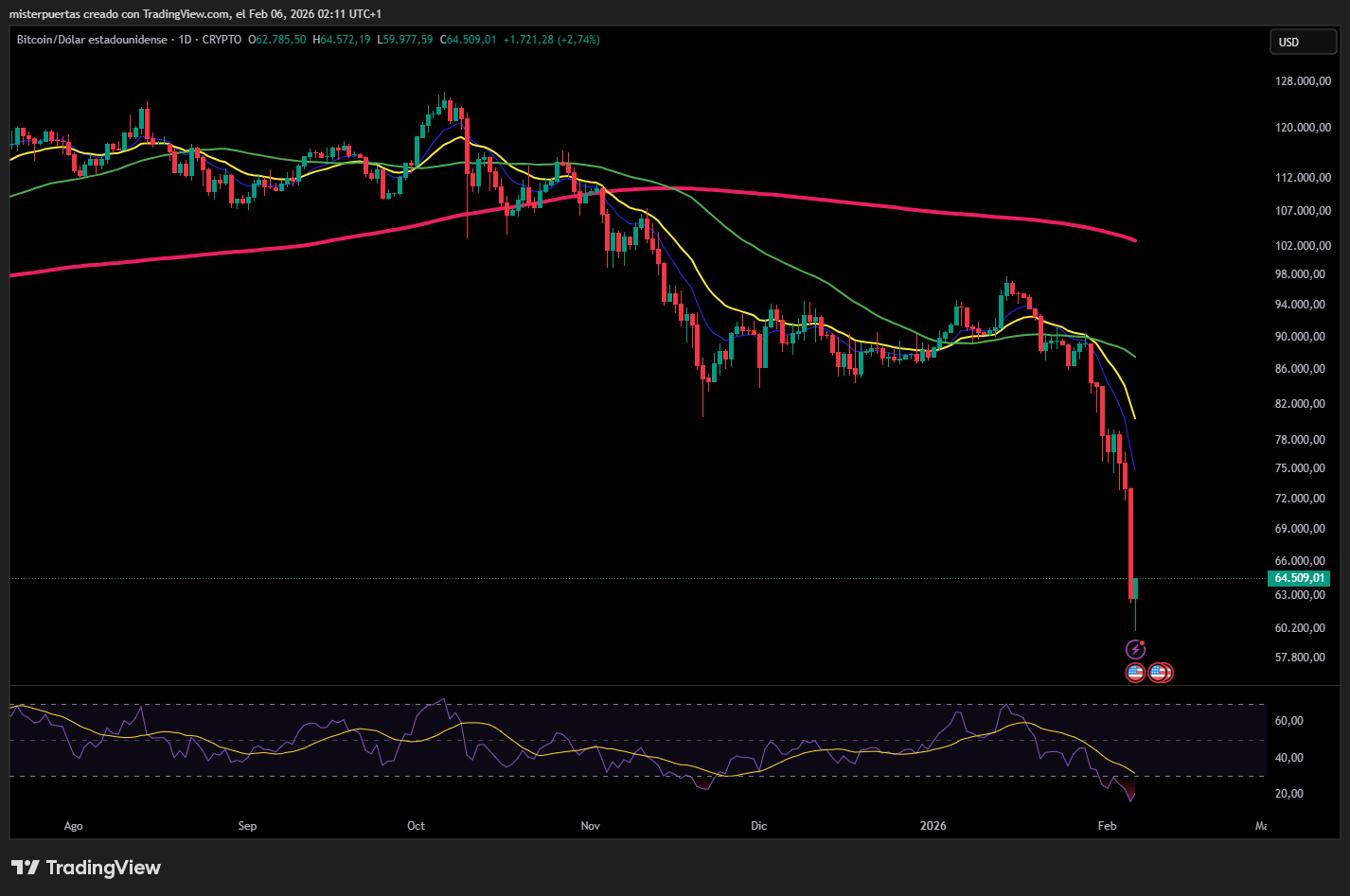 Lo que volvió a moverse con violencia —para sorpresa de nadie que revisara ayer las volatilidades— fueron los metales preciosos. La plata llegó a caer un 19%. El oro al contado intentó superar brevemente los 5.000 dólares, pero terminó cayendo otro 4%. Bitcoin cotizó nuevamente por debajo de los mínimos electorales de Trump, en torno a 62.000 dólares (el mismo nivel que tenía en noviembre de 2021). Fue la mayor caída diaria de Bitcoin desde el colapso de FTX, un movimiento de cinco sigmas en relación con los últimos tres años.