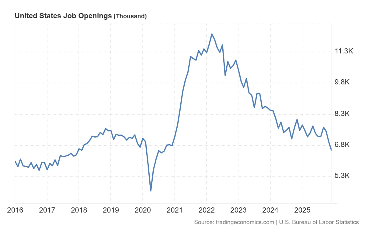 Las vacantes de empleo en EE. UU. cayeron en 386.000 hasta 6,542 millones en diciembre de 2025, el nivel más bajo desde septiembre de 2020 y muy por debajo de las expectativas del mercado (7,2 millones).
