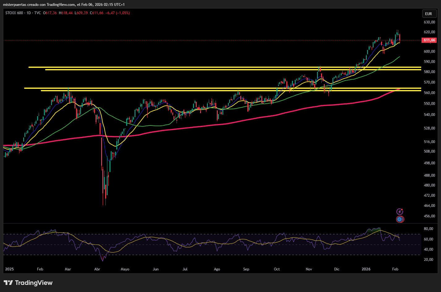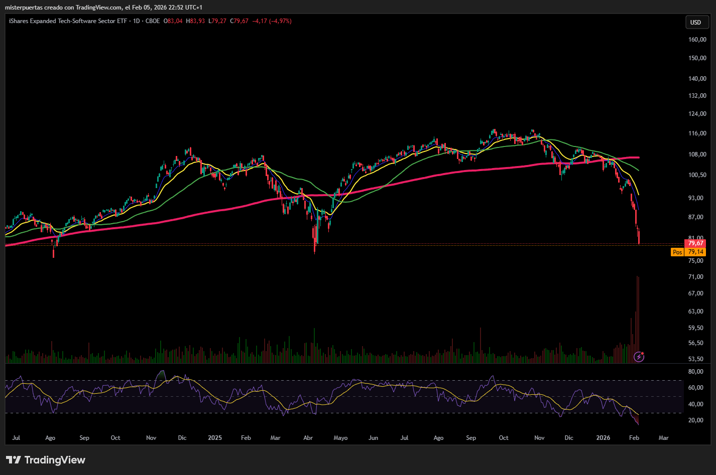 Tecnología y software siguieron siendo un lastre. El software está ahora en su nivel más alto de sobreventa desde junio de 2024 (y uno de los niveles más extremos de la historia), encadenando ocho sesiones consecutivas en rojo.