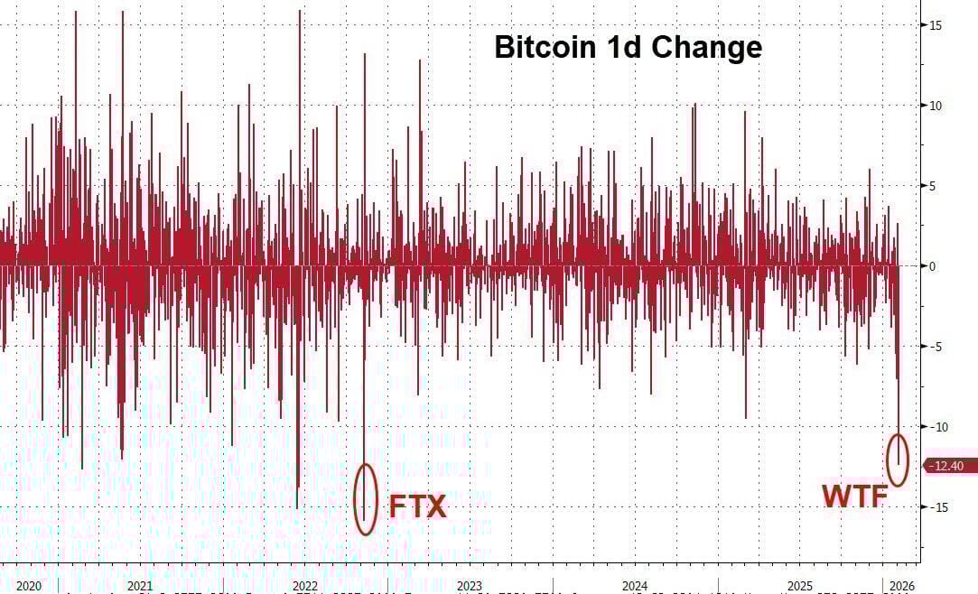 Fue la mayor caída diaria de Bitcoin desde el colapso de FTX, un movimiento de cinco sigmas en relación con los últimos tres años.