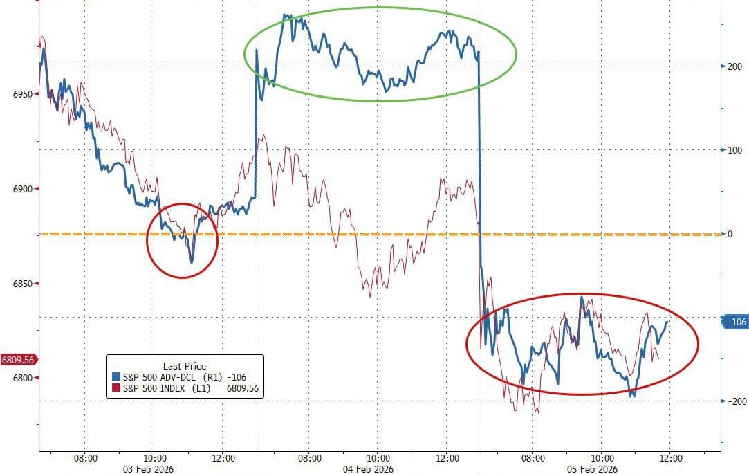 La amplitud del SPX, a diferencia de ayer, fue negativa: solo 200 nombres en verde durante la sesión. El Nasdaq extendió sus pérdidas por debajo de su media móvil de 100 días. Tecnología y software siguieron siendo un lastre. El software está ahora en su nivel más alto de sobreventa desde junio de 2024 (y uno de los niveles más extremos de la historia), encadenando ocho sesiones consecutivas en rojo. La volatilidad de las “Mag7” se está acelerando notablemente.