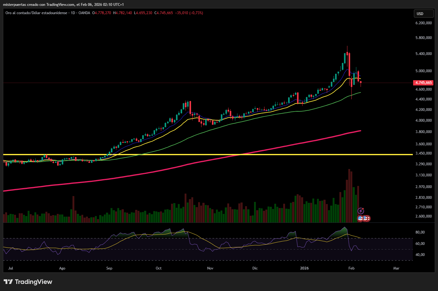 Lo que volvió a moverse con violencia —para sorpresa de nadie que revisara ayer las volatilidades— fueron los metales preciosos. La plata llegó a caer un 19%. El oro al contado intentó superar brevemente los 5.000 dólares, pero terminó cayendo otro 4%.