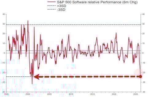 El sector de software en EE. UU. acaba de registrar su peor comportamiento relativo en 25 años, quedándose rezagado frente al S&P 500 en casi 30 puntos porcentuales en los últimos seis meses, lo que supone un movimiento a la baja de 3 sigmas para un sector que normalmente compone de forma silenciosa en segundo plano.