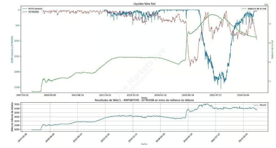 Curiosamente, la liquidez neta de la Fed en el último trimestre de 2025 empezó a presentar dificultades, cayendo a su menor nivel desde 2021.
