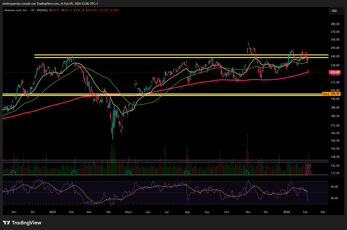 AMZN se desplomó en el after hours, cayendo hasta un 11%, cotizando alrededor de $200.