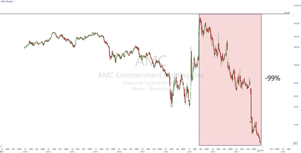 5- AMC Entertainment se ha desplomado un 99% desde su máximo histórico hasta mínimos históricos.