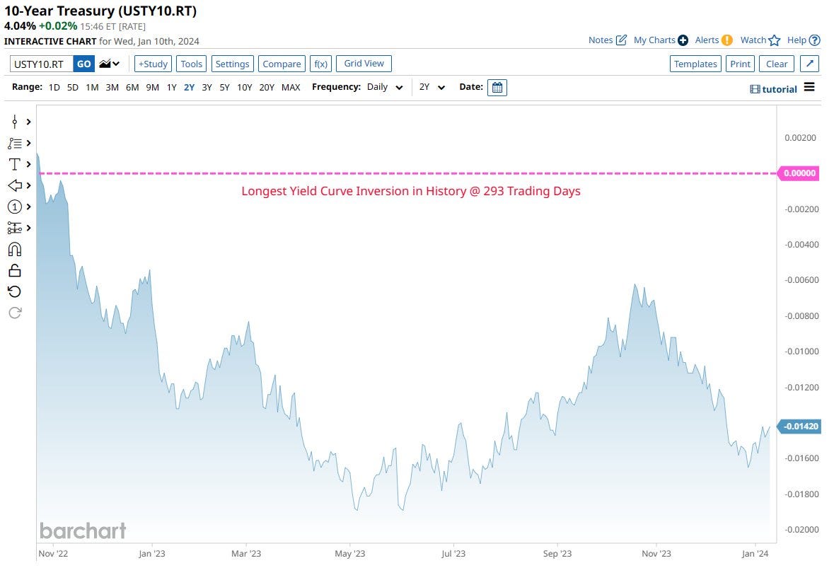1- La curva de rendimientos del Tesoro a 10 años menos 3 meses se ha invertido durante 293 días de negociación consecutivos, el periodo más largo de la historia.