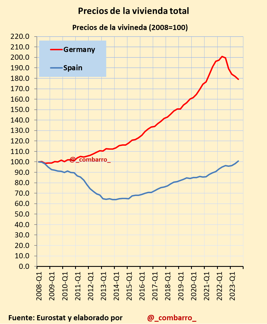 3- En este análisis no se comparan niveles, se comparan evoluciones relativas. En el año 2008 nosotros teníamos la burbuja inmobiliaria y otros países NO. Se aprecia que en Alemania aceleró precios hasta 2t-2022 y luego caída.