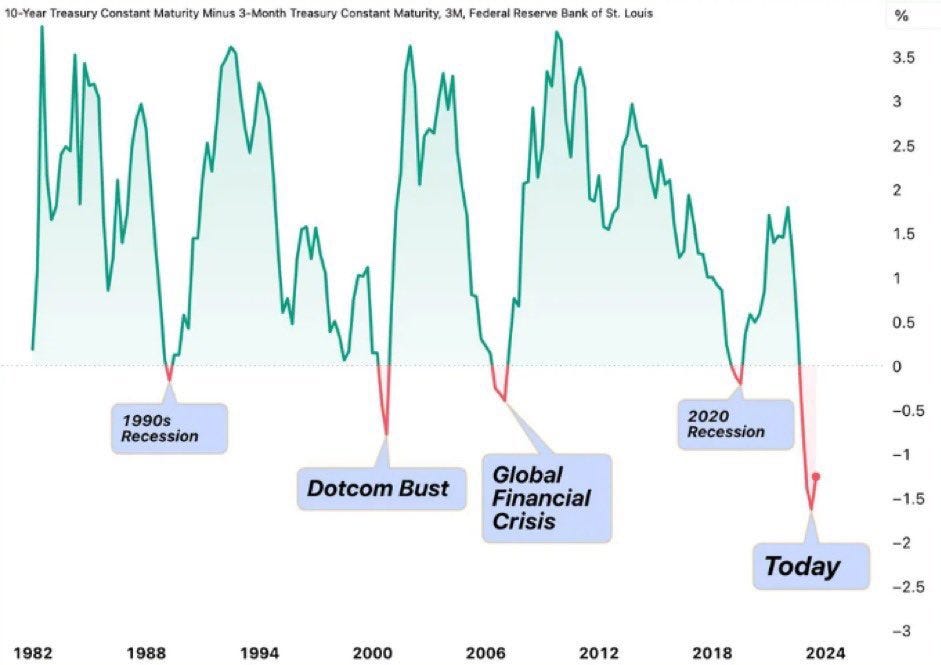 2- Las últimas 4 veces que la Curva de Rendimiento del Tesoro 10Y menos 3M se invirtió, condujo a la recesión de los 90, la Caída Dotcom, la Crisis Financiera Global y la Recesión de 2020.