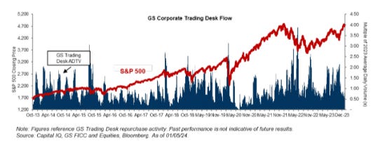 6- Las corporaciones comienzan a salir de la ventana de silencio a partir de mañana. Actualmente, el 85% de la capitalización de mercado del S&P se encuentra en la ventana de silencio. La ventana de silencio de GS se abre nuevamente el 29/01/24. Hoy es el pico de la ventana de silencio. Esto activa un comportamiento de $5 mil millones de VWAP por día más adelante en este mes.