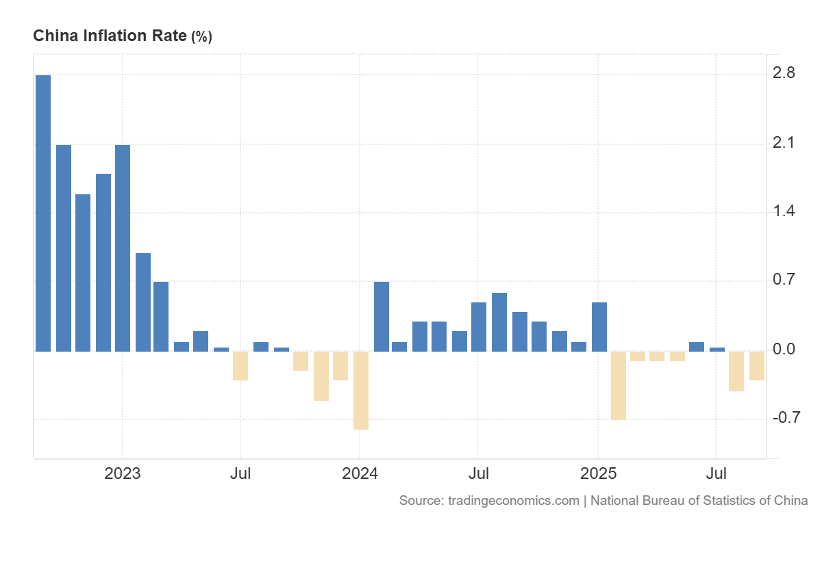 Los precios al consumidor en China cayeron un 0,3% interanual en septiembre de 2025, una caída mayor a la esperada por el mercado (-0,1%) pero algo menor que el descenso del 0,4% registrado el mes anterior.