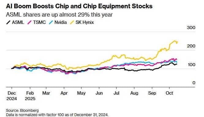ASML registró pedidos más fuertes de lo esperado en el tercer trimestre y dijo que las ventas del próximo año serían al menos iguales a las de 2025, ya que la inteligencia artificial impulsó la demanda de sus máquinas para fabricar chips.